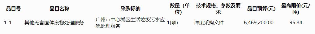 近日,广州市中心城区生活垃圾污水应急处理服务项目招标公告发布,公告显示预算金额:6469200元,详情如下: