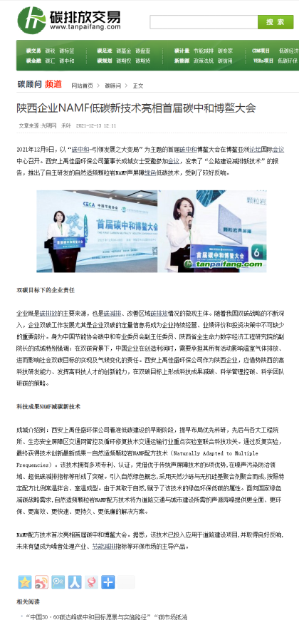 同日,碳交易排放网报道了一篇题为“陕西企业亮相首届碳中和博鳌大会”的文章,文章详细介绍了首届碳中和博鳌大会上西安上禹佳盛生态环保科技有限公司发布的最新科技成果——自然适频颗粒岩NAMF配方技术。