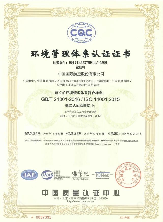 近日,中国质量认证中心为中国国际航空股份有限公司(简称“国航”)颁发了ISO14001环境管理体系认证证书,国航成为中国大陆首家全面通过环境管理体系认证的航空公司。