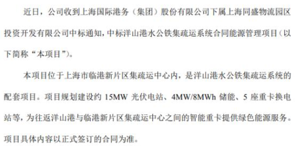上海电力(600021)发布公告,公司收到上海国际港务(集团)股份有限公司下属上海同盛物流园区投资开发有限公司中标通知,中标洋山港水公铁集疏运系统合同能源管理项目(以下简称“本项目”)。