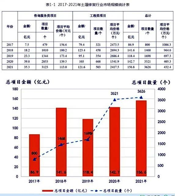 生态环境部环境规划院于2022年1月18日发布的《2021年土壤环境修复行业市场分析报告》(下称《分析报告》)介绍,我国土壤环境修复项目数量逐年增加,修复工程市场总投资规模逐渐稳定在100亿元上下,建设用地修复工程类项目的数量最多。