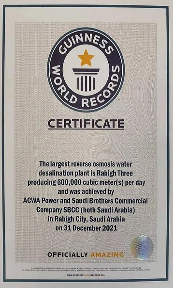 近日,中国电建所属山东电建三公司总承包的沙特拉比格三期海水淡化项目收到吉尼斯世界纪录证书,正式成为世界最大的单体反渗透海水淡化项目。