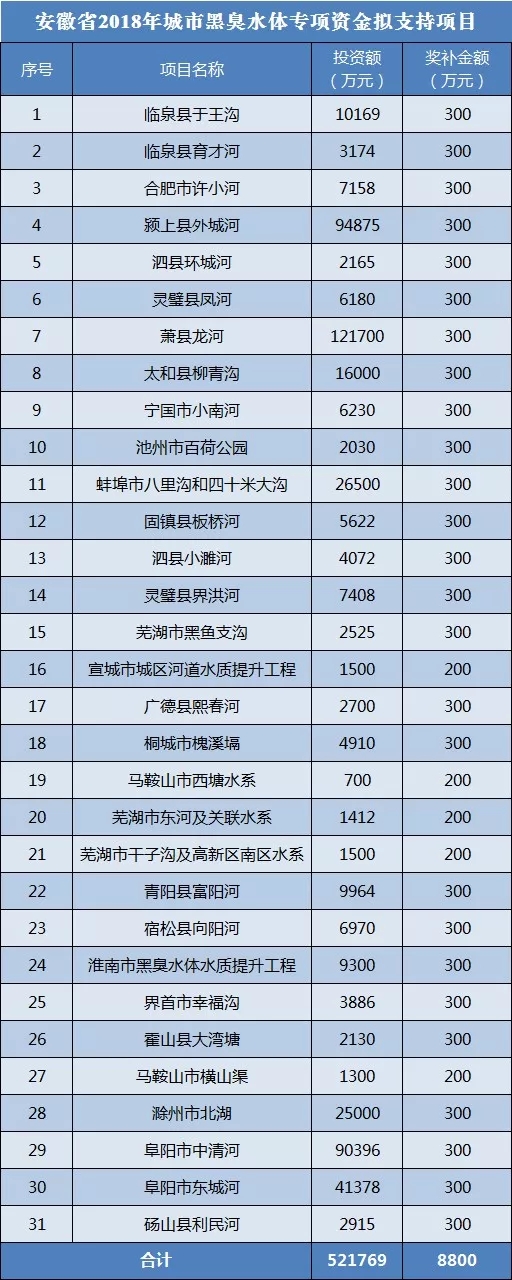 根据安徽省住房和城乡建设厅、安徽省财政厅印发的《安徽省城市黑臭水体整治项目申报指南》等有关规定要求,经市县申报、专家审查、初步审核等程序,现将全省2018年城市黑臭水体治理专项资金拟支持项目及专项资金分配方案予以公示。