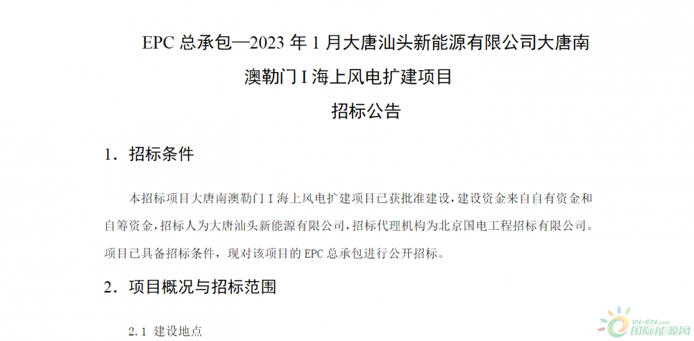 12月14日,大唐电子商务平台发布《EPC总承包-2023年1月大唐汕头新能源有限公司大唐南澳勒门I海上风电扩建项目》招标公告。