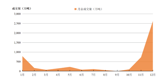 2022年全国碳市场的交易主要集中在年初和年末,1-2月、11-12月成交量分别占全年总成交量的19%、66%。