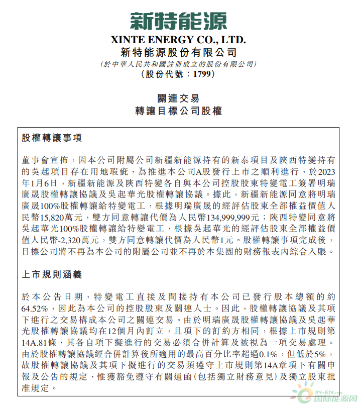 1月6日,新特能源发布公告披露,因公司附属公司新疆新能源持有的新泰项目及陕西特变持有的吴起项目存在用地瑕疵,为推进公司A股发行上市的顺利进行,于2023年1月6日,新疆新能源及陕西特变各自与公司控股股东特变电工签署明瑞广晟股权转让协议及吴起华光股权转让协议。据此,新疆新能源同意将明瑞广晟100%股权转让给特变电工,根据明瑞广晟的经评估股东全部权益价值人民币15,820万元,双方同意转让代价为人民币134,999,999元;陕西特变同意将吴起华光100%股权转让给特变电工,根据吴起华光的经评估股东全部权益价值人民币-2,320万元,双方同意转让代价为人民币1元。