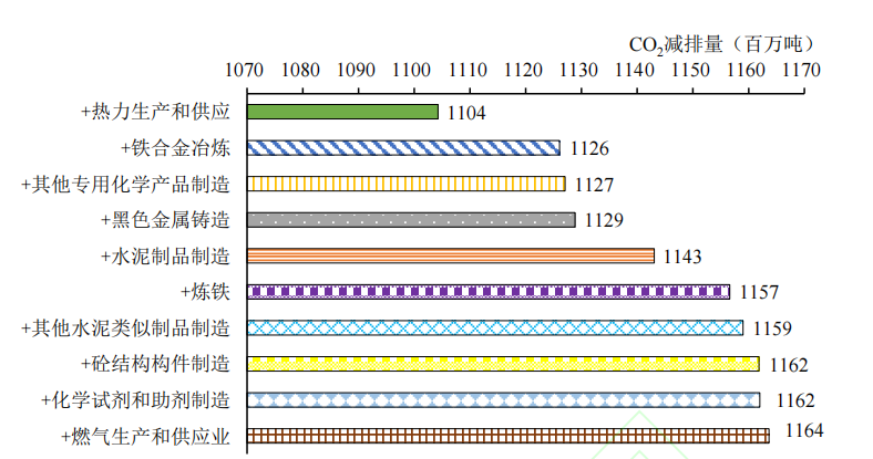 水泥制造(减排量856.46兆吨、减排成本节约占比22.5%),炼钢(936.52兆吨,23.7%),