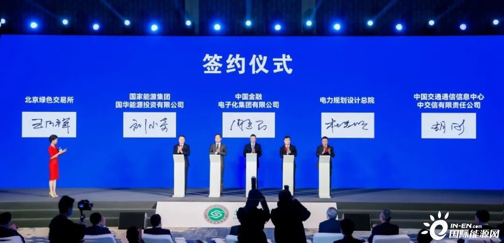 在北京城市副中心建设国家绿色发展示范区-打造国家级绿色交易所启动仪式的金融科技与绿色产业合作签约环节,北京绿色交易所董事长王乃祥与中国金融电子化集团有限公司党委书记、董事长周逢民,国家能源集团国华能源投资有限公司党委书记、董事长刘小奇,电力规划设计总院党委书记、院长杜忠明,中国交通通信信息中心中交信有限责任公司总经理胡刚分别签署战略合作协议。