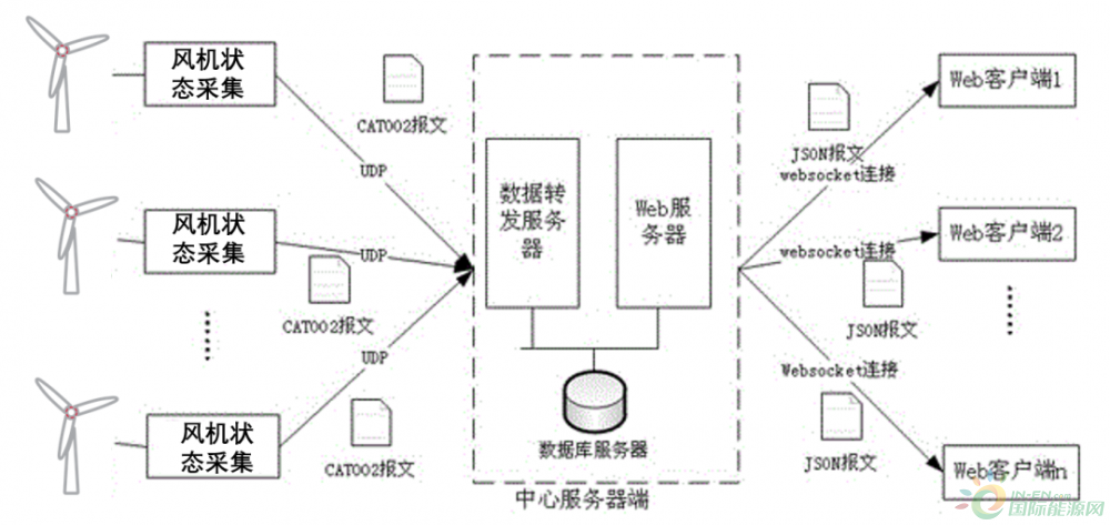 WebSocket主要用在B/S架构的风电场在线监测系统设计和开发,风电监控系统的实时数据监控是将风力发电机组数据采集并完成数据预处理之后、使用MQTT协议采用发布-订阅模式将消息发送到Websocket服务端,Websocket服务端利用Websocket协议将这些数据推送到浏览器端,更新实时数据显示页面,保障数据监视的实时性。
