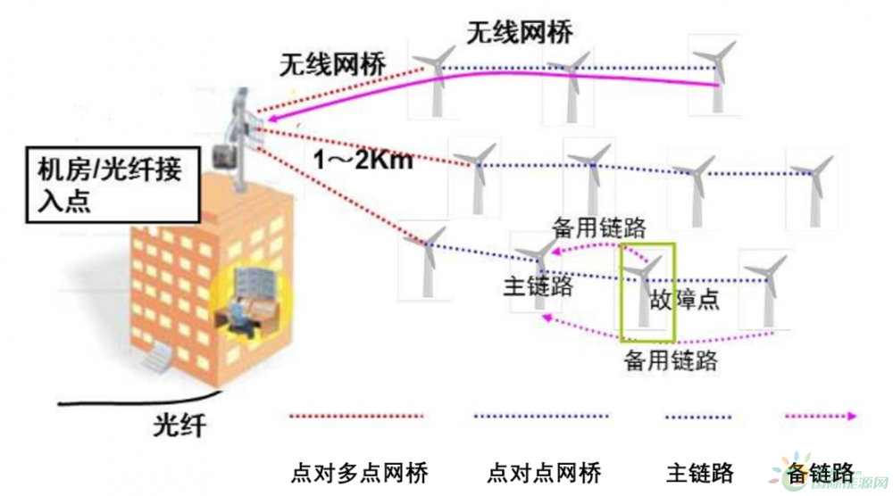 风电场内WLAN局域网系统通信,相对各种技术比较后和使用后,目前相对采用较多的是最成熟、稳定的WIFI技术,采用多跳MESH网桥无线组网,所有风机的数据可以通过无线汇聚到控制中心。控制中心与风机之间采用点对多点模式,风机之间采用MESH自组网模式。