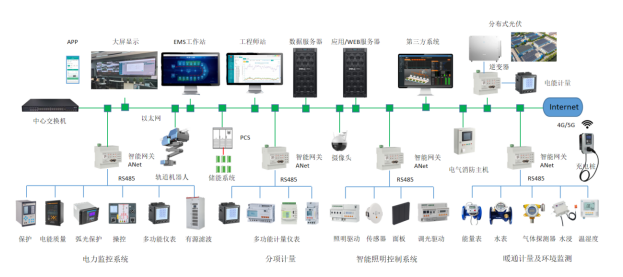 AcrelEMS企业能源管理系统融合企业负荷侧的电力监控、能耗统计、电能质量分析及治理、智能照明控制、主要用能设备监控、充电桩运营管理、分布式光伏监控、储能管理等功能,用户通过一个能源中心即可全局、整体的对企业能源管理进行进行集中监控、统一调度、统一运维,同时满足企业用电可靠、安全、节约、高效、有序用电要求,系统架构图如图2.1所示。