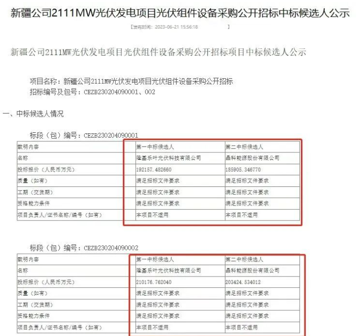 今天,该项目公布了中标候选人,两个标段的第一、第二中标人均隆基乐叶、晶科能源。以隆基乐叶为例,两个标段的投标价格分别为1.506元/W、1.515元/W。