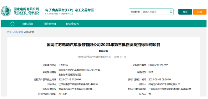 国网江苏电动汽车服务有限公司2023年第三批物资类招标采购项目