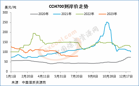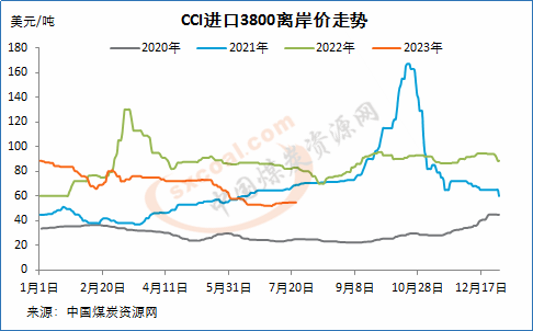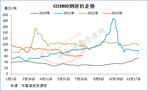 截止7月21日,CCI进口3800大卡动力煤中国南方港到岸价为62.5美元/吨,较前一周上涨0.2美元/吨;CCI进口4700大卡动力煤到岸价为79.5美元/吨,较前一周上涨0.5美元/吨;CCI进口5500大卡动力煤到岸价为100美元/吨,较前一周持平。