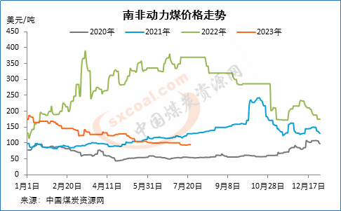 上周,铁路检修部分影响了南非主产区至港口的煤炭运输,但并未对南非动力煤价格带来明显支撑。截止7月21日,南非理查兹湾动力煤离岸价为95.2美元/吨,较前一周上涨1美元/吨,较上月同期下降6.8美元/吨。