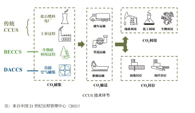 除了传统的CCUS,目前还衍生出了生物质能结合碳捕集与封存(BECCS)和直接空气碳捕集与封存(DACCS)等负排放技术。作为实现碳中和的碳捕集与封存的有效手段,BECCS和DACCS被各个国家寄予厚望。
