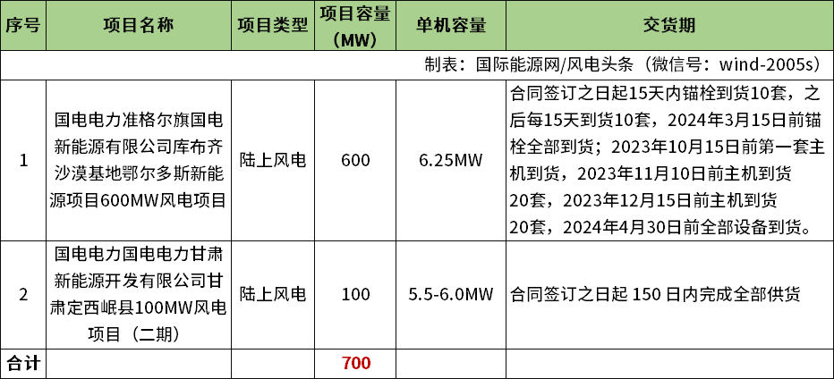 国际能源网/风电头条(微信号:wind-2005s)获悉,9月1日,国家能源集团发布国电电力准格尔旗国电新能源有限公司库布齐沙漠基地鄂尔多斯新能源项目600MW风电项目风力发电机组采购、国电电力国电电力甘肃新能源开发有限公司甘肃定西岷县100MW风电项目(二期)风力发电机组采购公开招标项目招标公告。规模总计700MW,要求单机容量5.5-6.25MW。