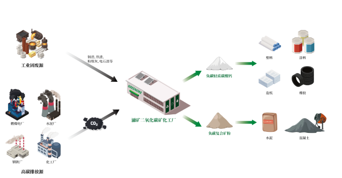 在适用性方面,瀜矿该项技术可处理钢渣、铁渣、粉煤灰、电石渣等工业固废,可利用来自于钢铁厂、燃煤电厂、水泥厂、化工厂等企业排放的二氧化碳,适用于各类高碳排放行业。