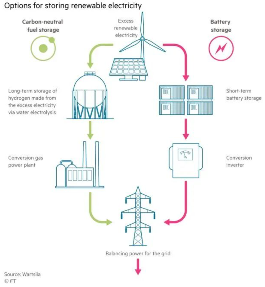 例如,在需求疲弱时段内产生的多余可再生电力,可以转而为电解机提供动力来制氢,被储存起来的氢等于一种无碳清洁能源的长期储能方式,以便在未来需求最旺盛时供调度分发。