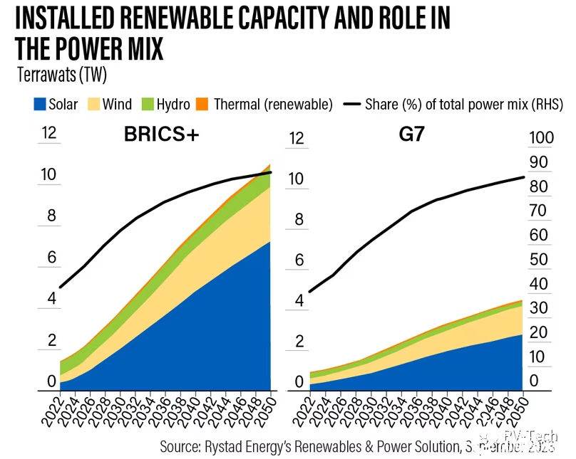 Rystad Energy称,预计至2050年,该集团80%以上的电力将来自可再生能源,总容量将达到11TW,是七国集团4.5TW预期发电总量的两倍多。