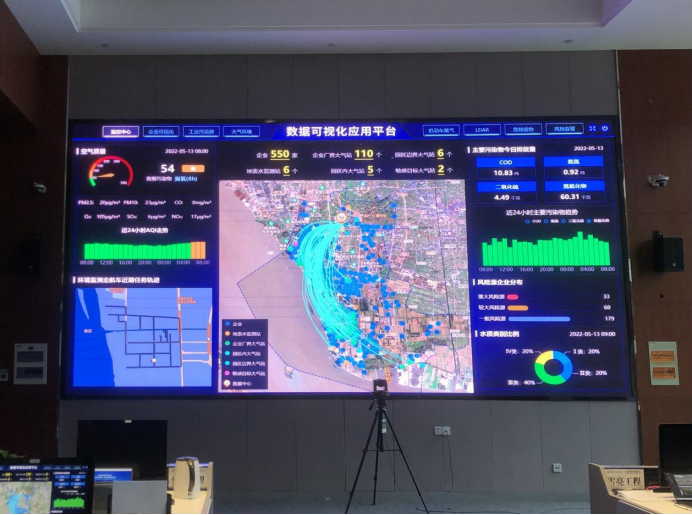 大屏上,园区空气、水质监测点、企业污染源在线监测等系统的实时数据在这里汇集成网、一目了然。同时,全区重点纳管企业全部安装总量控制智能终端,平台实现缴费排污、限量排污、超排关阀、总量可控的精准管控。