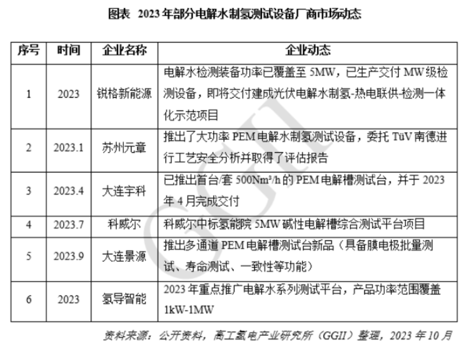 高工产研氢电研究所(GGII)调研统计,目前国内布局电解水制氢测试的设备厂商超过10家,多家燃料电池测试设备厂商将业务拓展至电解水制氢测试领域,同时第三方测试平台也展露头角。